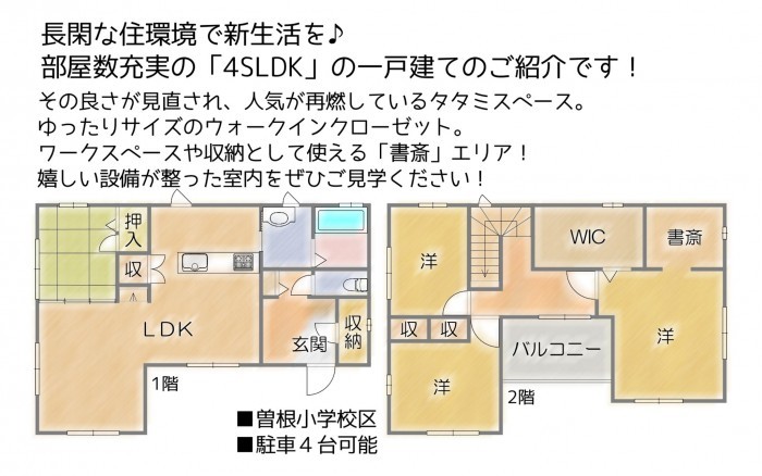 - 側溝、システムキッチン、カウンターキッチン、食器洗浄乾燥機、IHクッキングヒーター、浴室乾燥機、複層ガラス、ウォークインクローゼット、モニタ付インターホン、床下収納、駐車4台可能