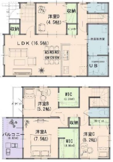 - 側溝、システムキッチン、カウンターキッチン、食器洗浄乾燥機、複層ガラス、ルーフバルコニー、ウォークインクローゼット、駐車場3台分、トイレ2箇所、パントリー