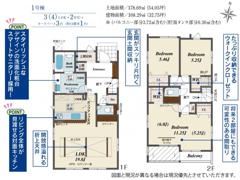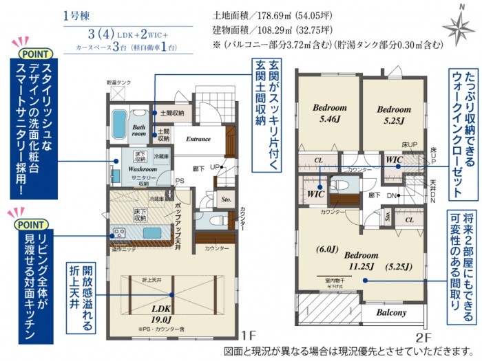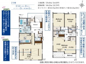 - システムキッチン、カウンターキッチン、食器洗浄乾燥機、IHクッキングヒーター、オール電化、シャンプードレッサー、浴室乾燥機、複層ガラス、ウォークインクローゼット、モニタ付インターホン、駐車場3台分、床下収納、エコキュート、トイレ2箇所