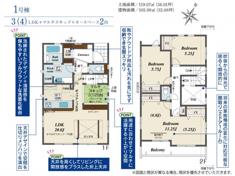 - システムキッチン、カウンターキッチン、食器洗浄乾燥機、シャンプードレッサー、複層ガラス、モニタ付インターホン、駐車場2台分、床下収納、トイレ2箇所
