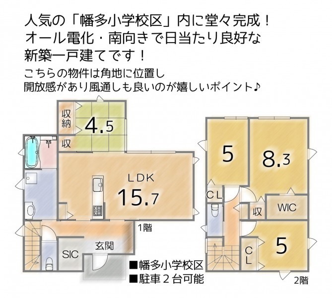 - カウンターキッチン、食器洗浄乾燥機、IHクッキングヒーター、オール電化、浴室乾燥機、ウォークインクローゼット、モニタ付インターホン、駐車場2台分、床下収納、シューズインクローゼット、パントリー