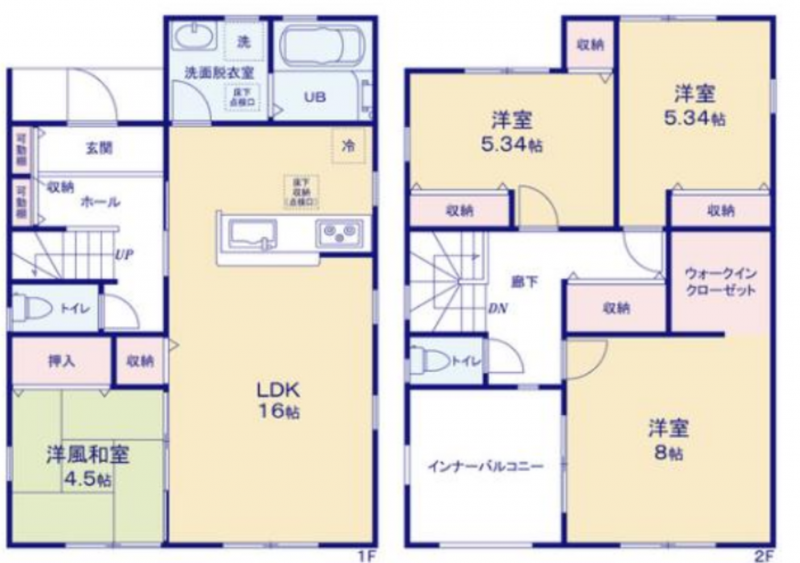 - システムキッチン、カウンターキッチン、シャンプードレッサー、洗浄便座、浴室乾燥機、ウォークインクローゼット、モニタ付インターホン、駐車場2台分、床下収納、トイレ2箇所