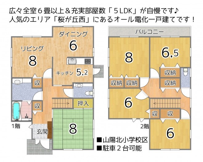 - システムキッチン、IHクッキングヒーター、オール電化、洗浄便座、追い焚き、駐車場2台分、トイレ2箇所