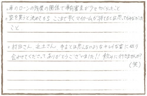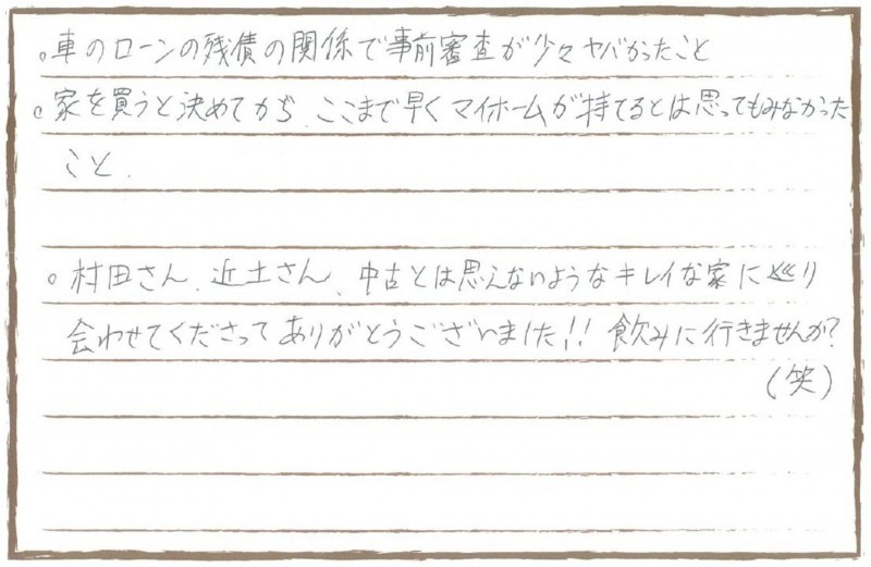 ・村田さん、近土さん、中古とは思えないようなキレイな家に巡り会わせてくださってありがとうございました!!