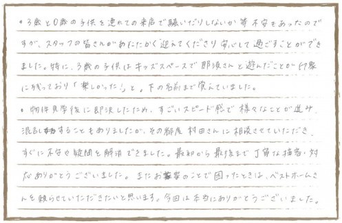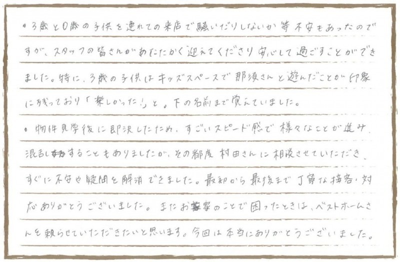 初めてご見学された、条件ピッタリの物件を買い逃さずご縁をつなげられたこと、とても嬉しく思っています。