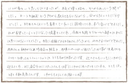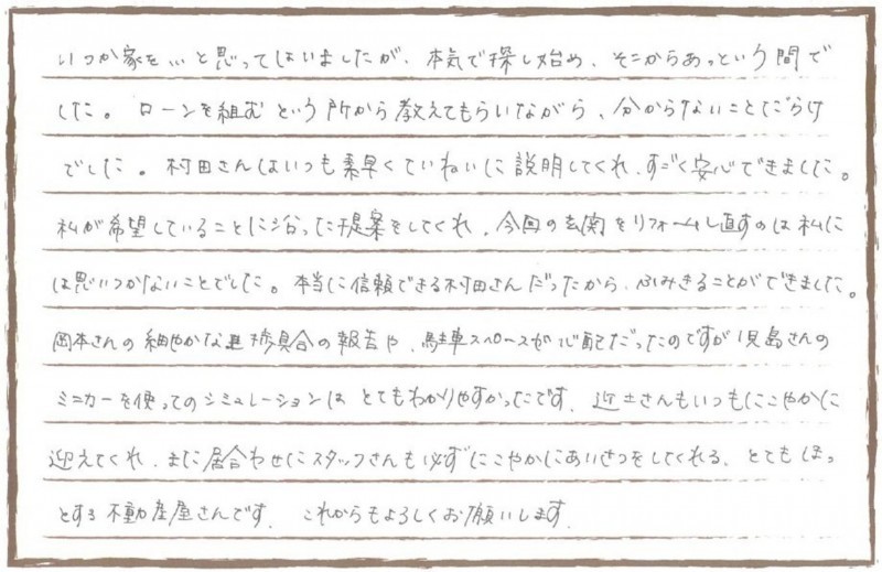 村田さんはいつも素早くていねいに説明してくれ、すごく安心できました。
